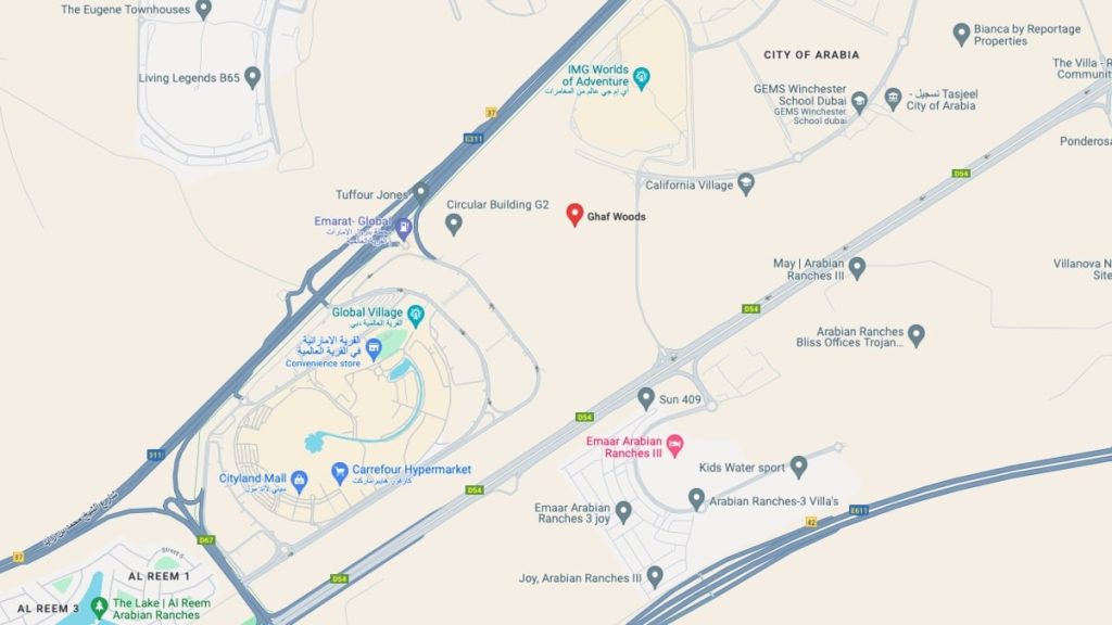 Ghaf Woods is located next to Global Village and in between Sheikh Mohammed Bin Zayed Rd and Sheikh Bin Hamdan Al Nahyan Street.