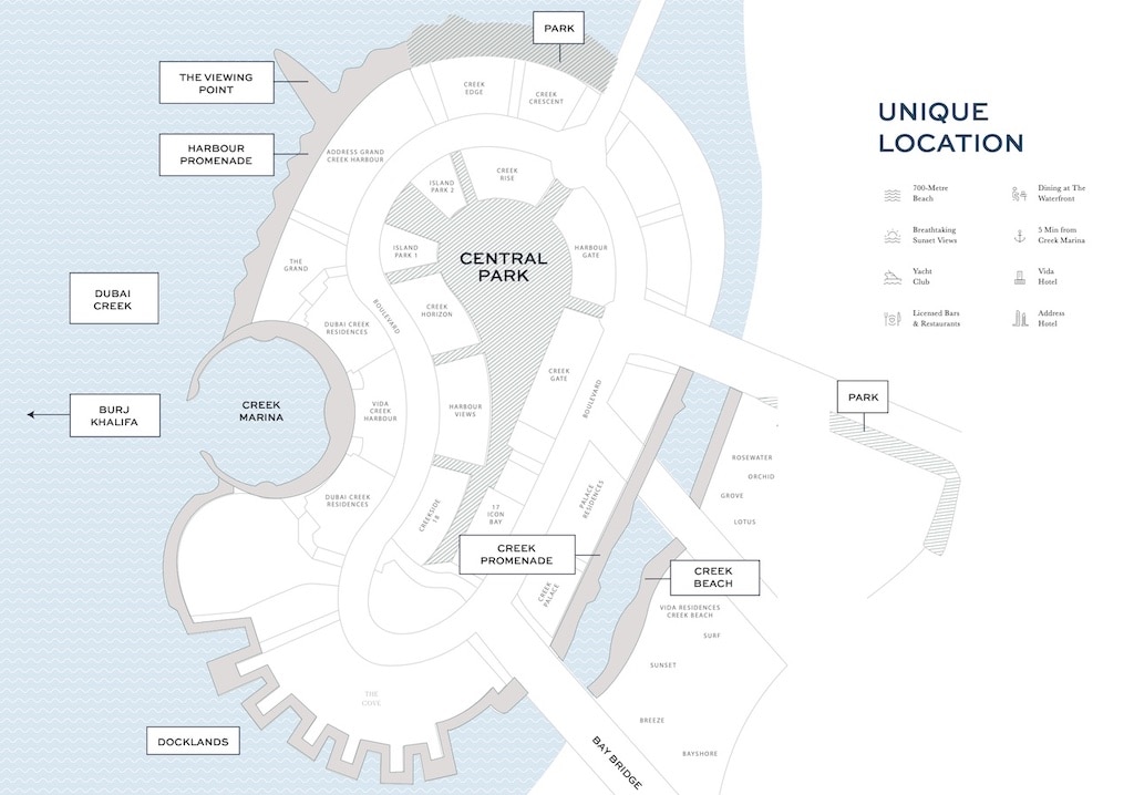 As of 2023, the majority of development at Dubai Creek has happened in the Island District appropriately named Creek Island. A genuinely stunning waterfront location Creek Island mixes upscale residences with a host of leisure and recreational amenities. Included within the district are a central park, a stunning marina, a world-class yacht club, and a family-friendly promenade offering unrivaled views of the sunset and Downtown Dubai.